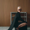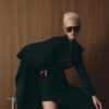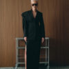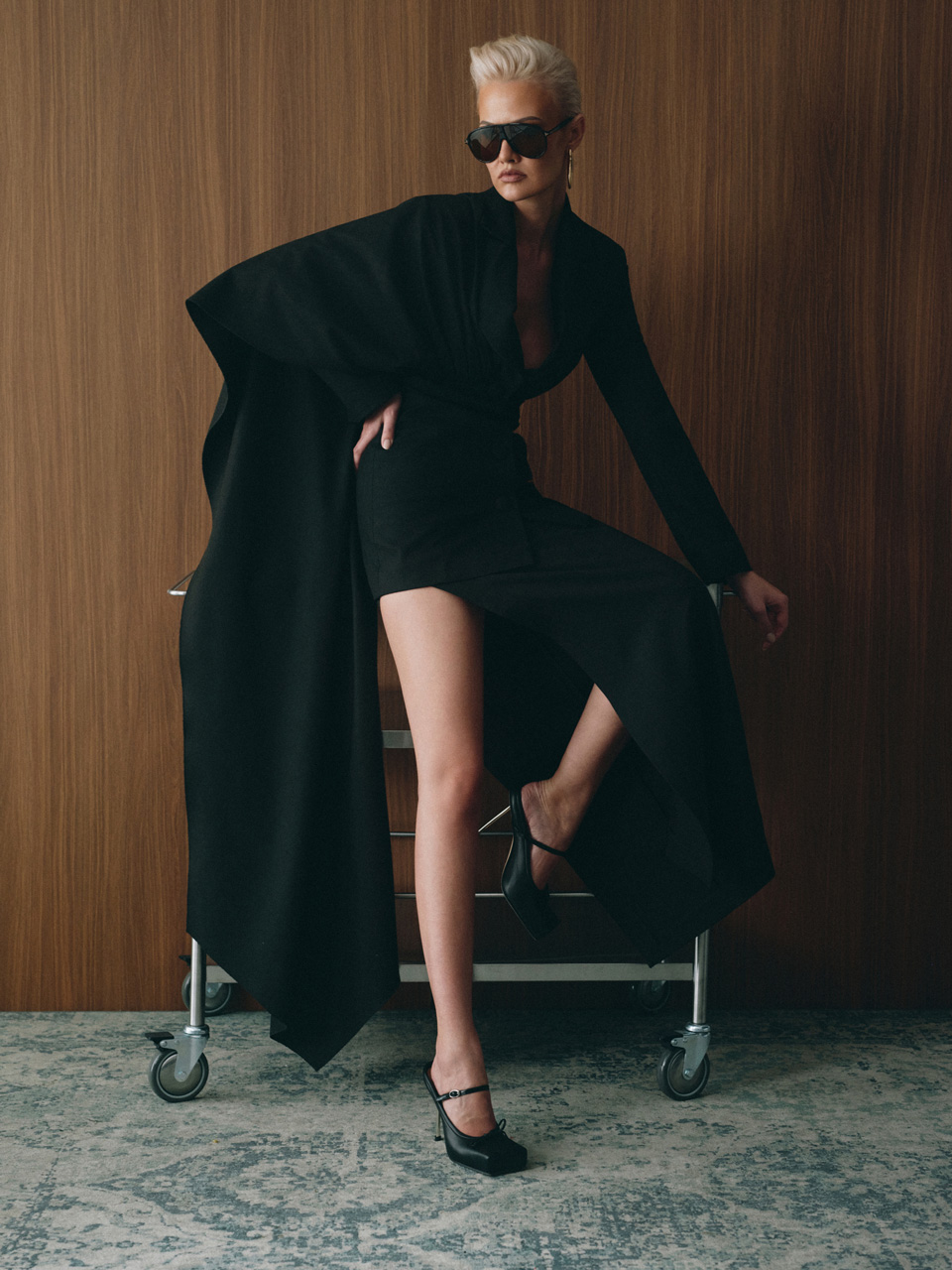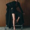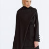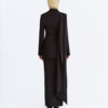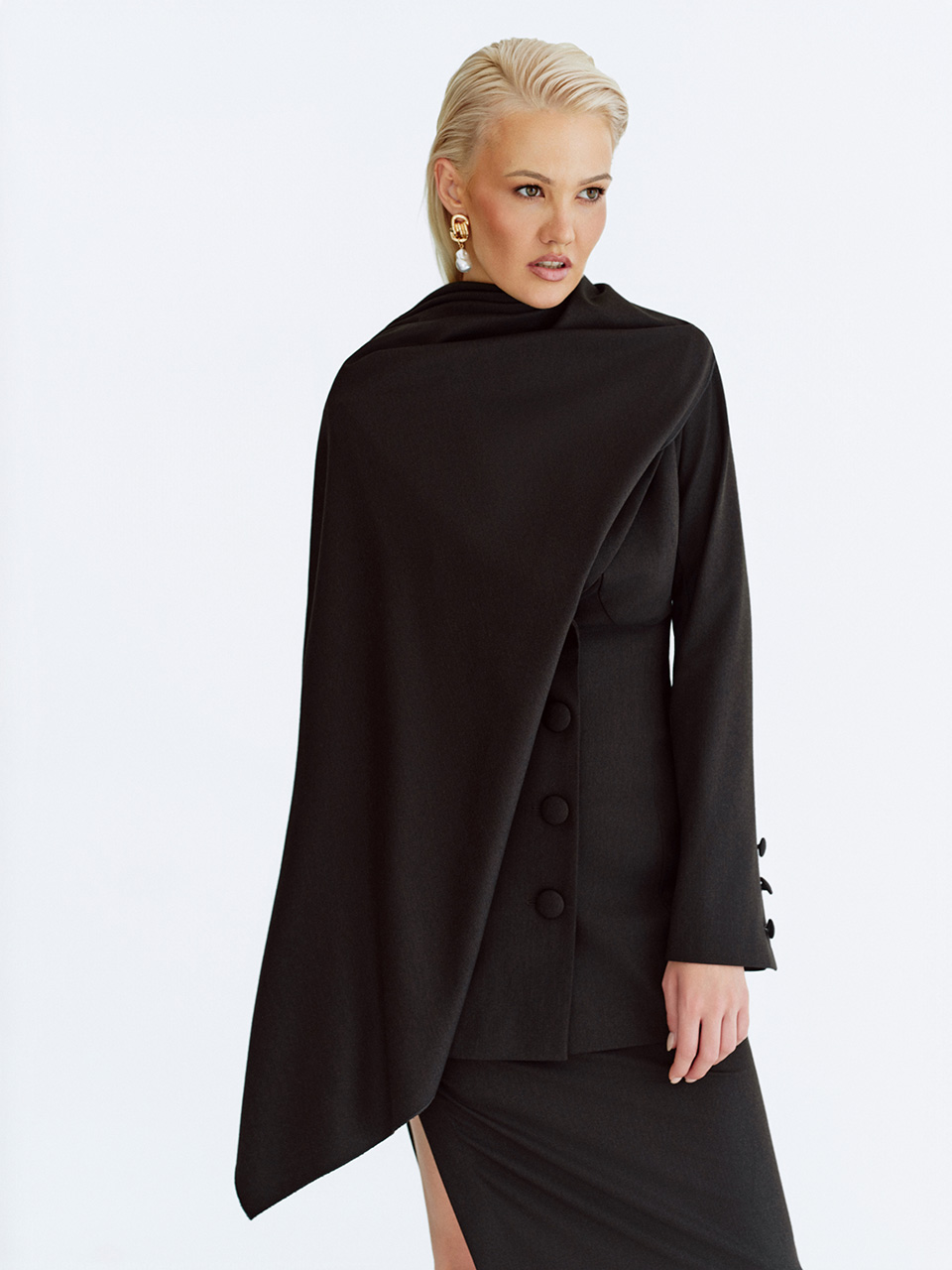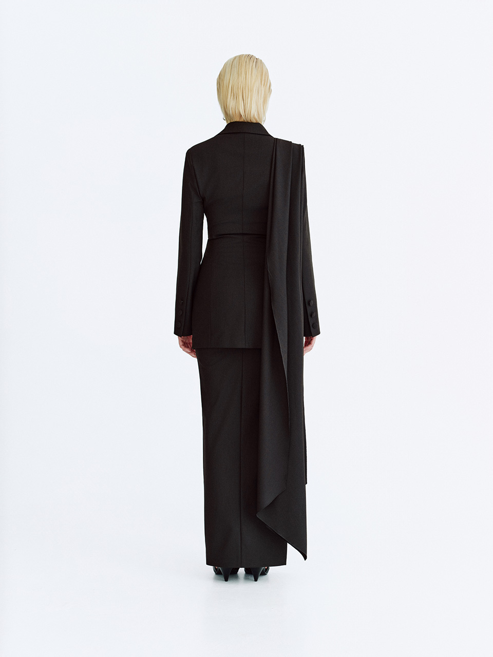 Wool cinched blazer with cutout details and attached massive scarf at the front with front button fastening. Padded