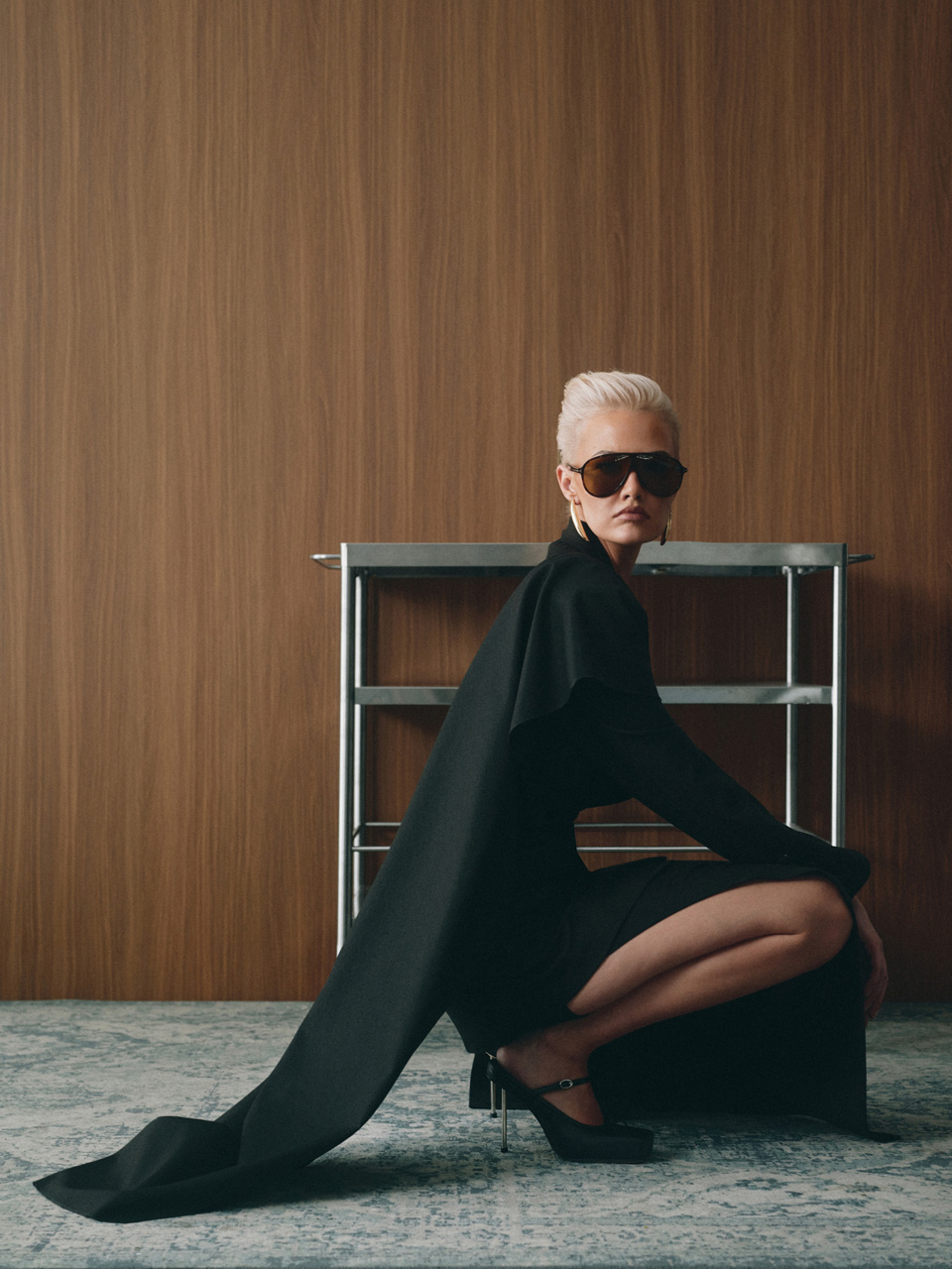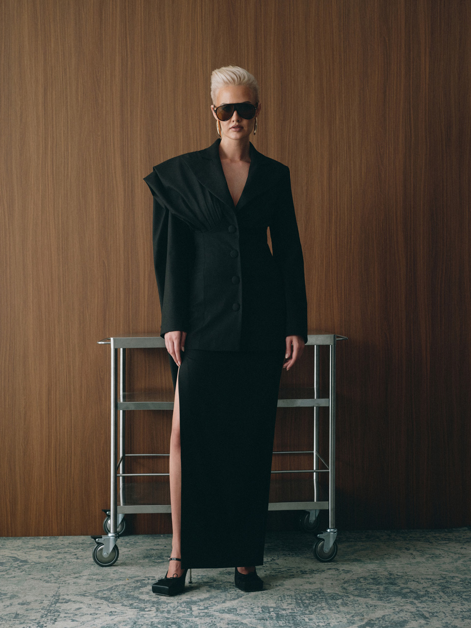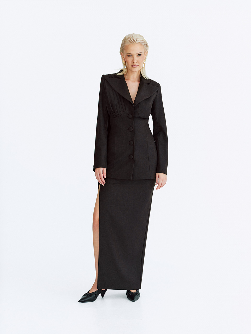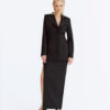 shoulders. Lined. Extra long, straight line skirt with deep side slit.
